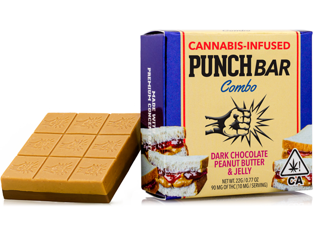 - Chocolate: Cannabis infused Punch Bar original edibles chocolate, has 10 available flavors in 100mg namely, MINT dark chocolate, TANGERINE dark chocolate, dark chocolate RASPBERRY, MILK chocolate, TOFFEE milk chocolate, milk chocolate CARAMEL BITS, dark chocolate SEA SALT, S’MORES milk chocolate, milk chocolate MALTED CRUNCH, and WHITE chocolate, with a net weight of 22grams or 0.77ounce. when consumed, it takes about 60 to 90 minutes to reach its peak effect. Cannabis infused punch bar edibles CREAM, has three available white chocolate flavors in 100mg namely, Kie Lime Pie, Cookies N’ Cream, Strawberry Cheesecake. With a Net weight of 22grams or 0.77ounce. When consumed just like the other chocolates, it takes about 60 to 90 minutes to reach its peak effect. Cannabis infused punch bar SUGAR FREE edibles, has available five flavors in 100mg namely, Dark Chocolate, chocolate Cappuccino, Hazelnut Milk, Milk Chocolate, Cookies Delight. Cannabis infused Punch Bar Edibles-Combo edibles is available in three flavors peanut butter and chocolate in 100mg, Dark chocolate peanut jelly, Peanut butter milk chocolate, Peanut butter dark chocolate. Punch Bar C-90 is available in 5 different flavors pure CBD and 0% THC 90mg specifically, milk chocolate, mint chocolate, toffee milk, dark chocolate and fruit snacks.